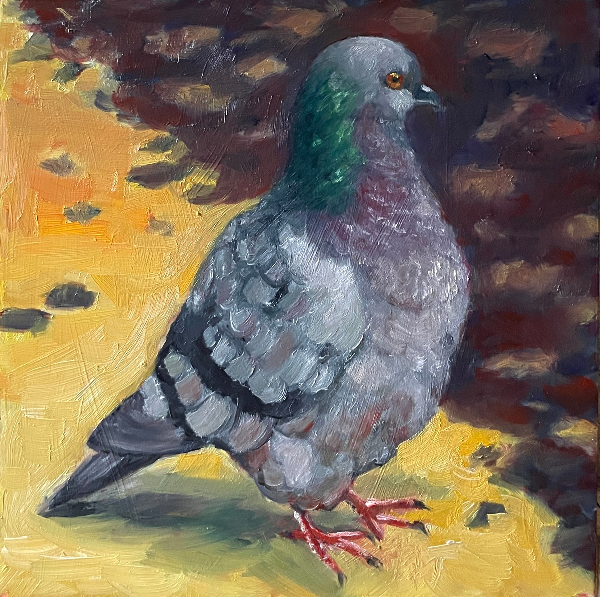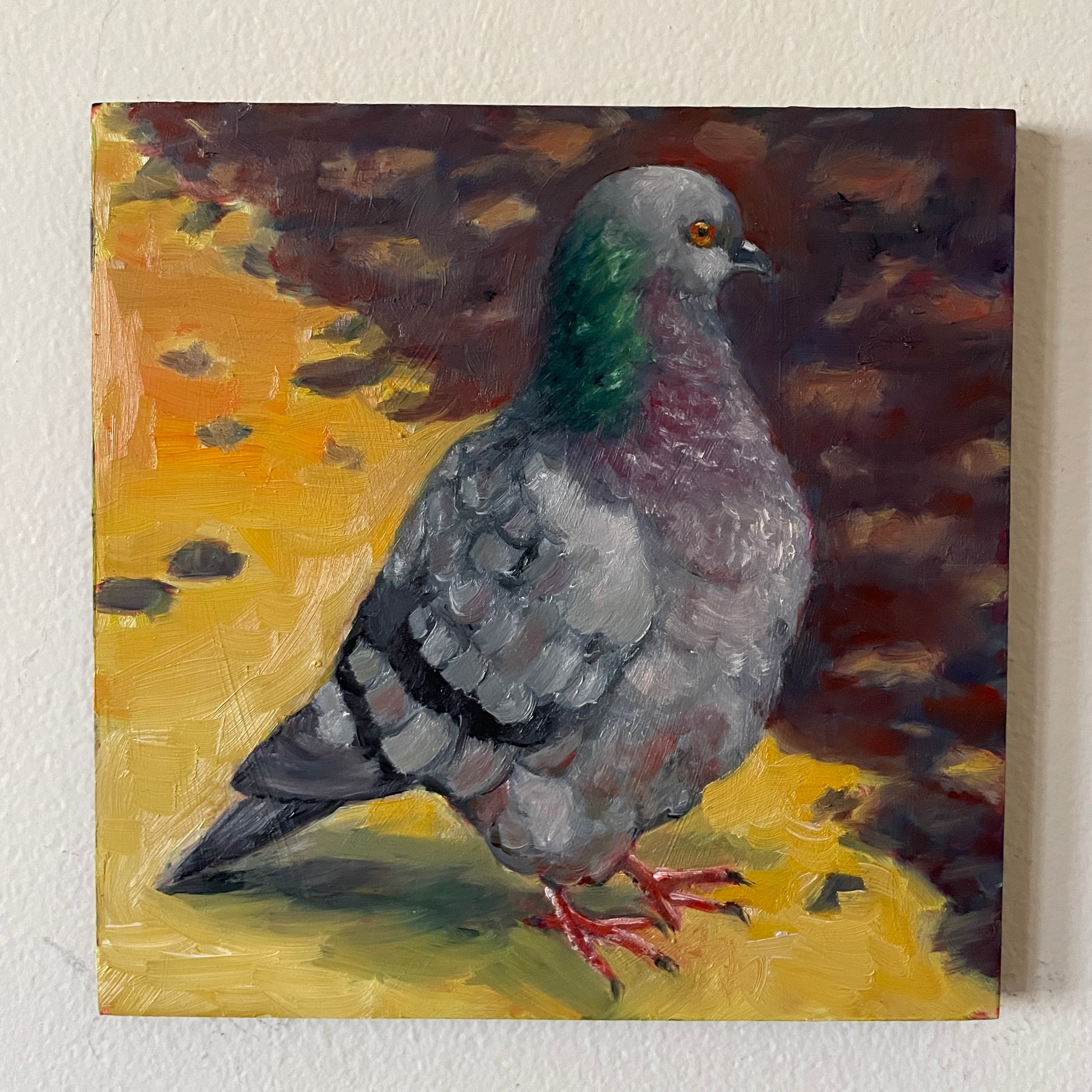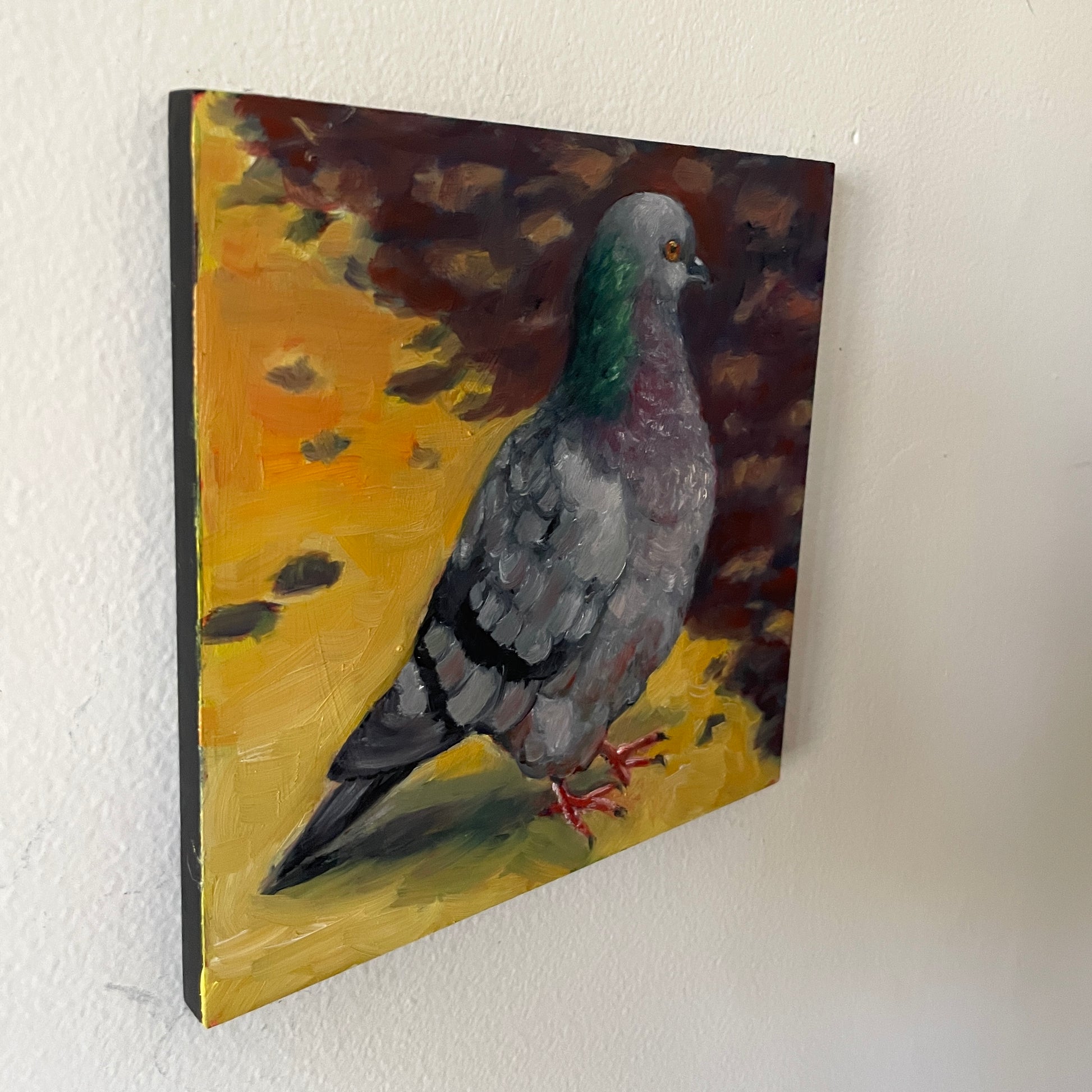 A fluffy dumb bird looking for crumbs. This original oil painting is on a cradled 6 x 6" wood board. It has a thin profile, with the sides painted black and a keyhole feature on the back that allows for hanging without the need for a frame.