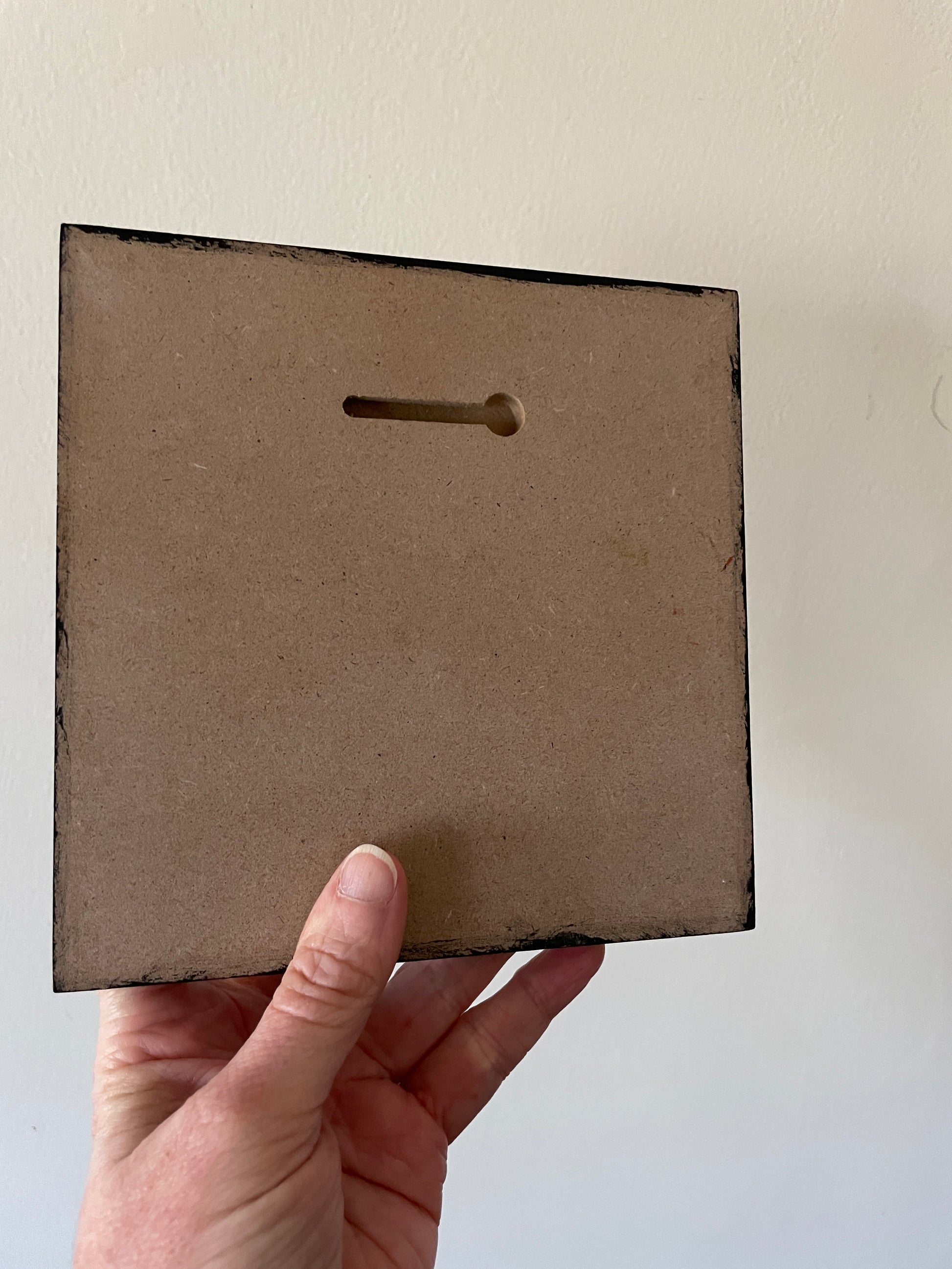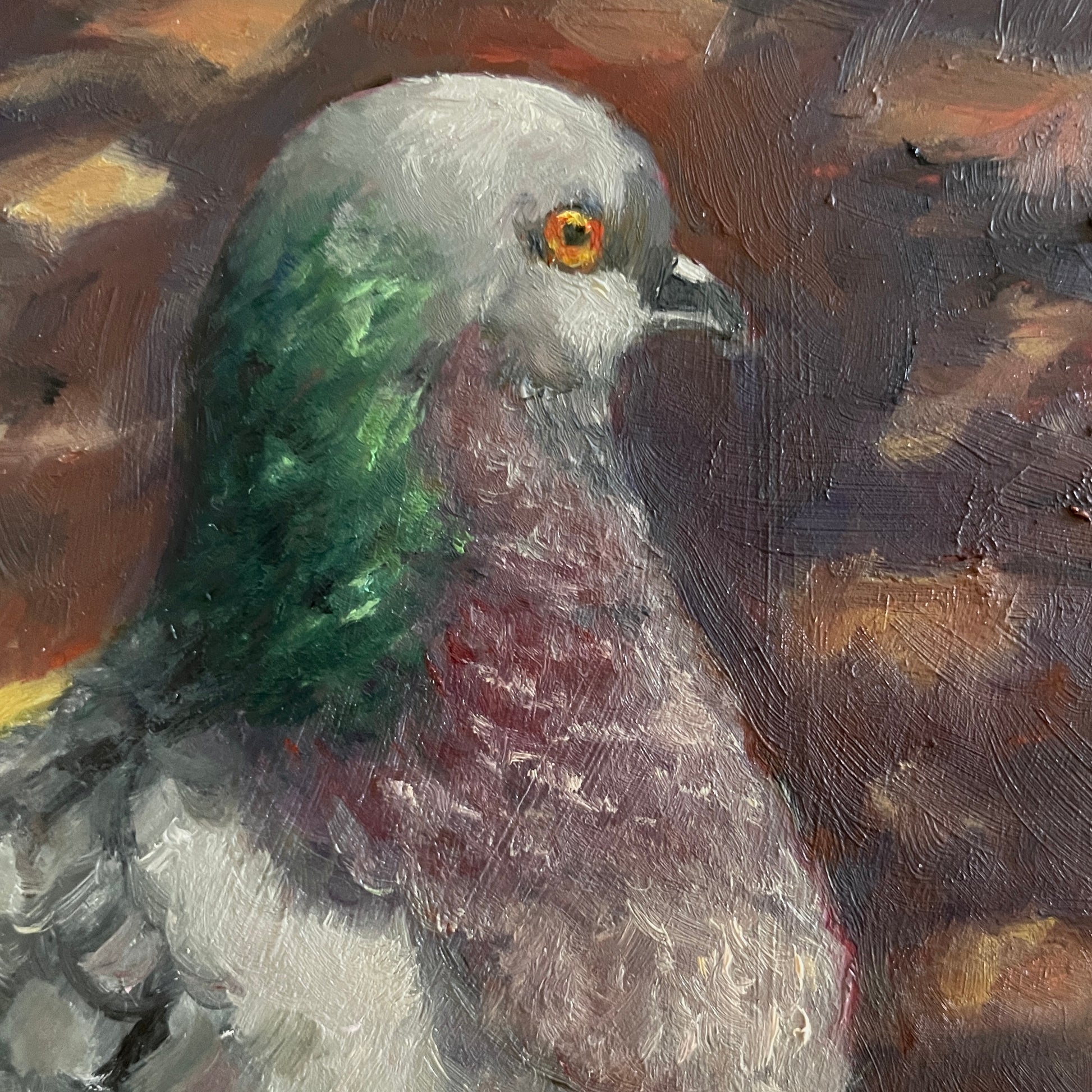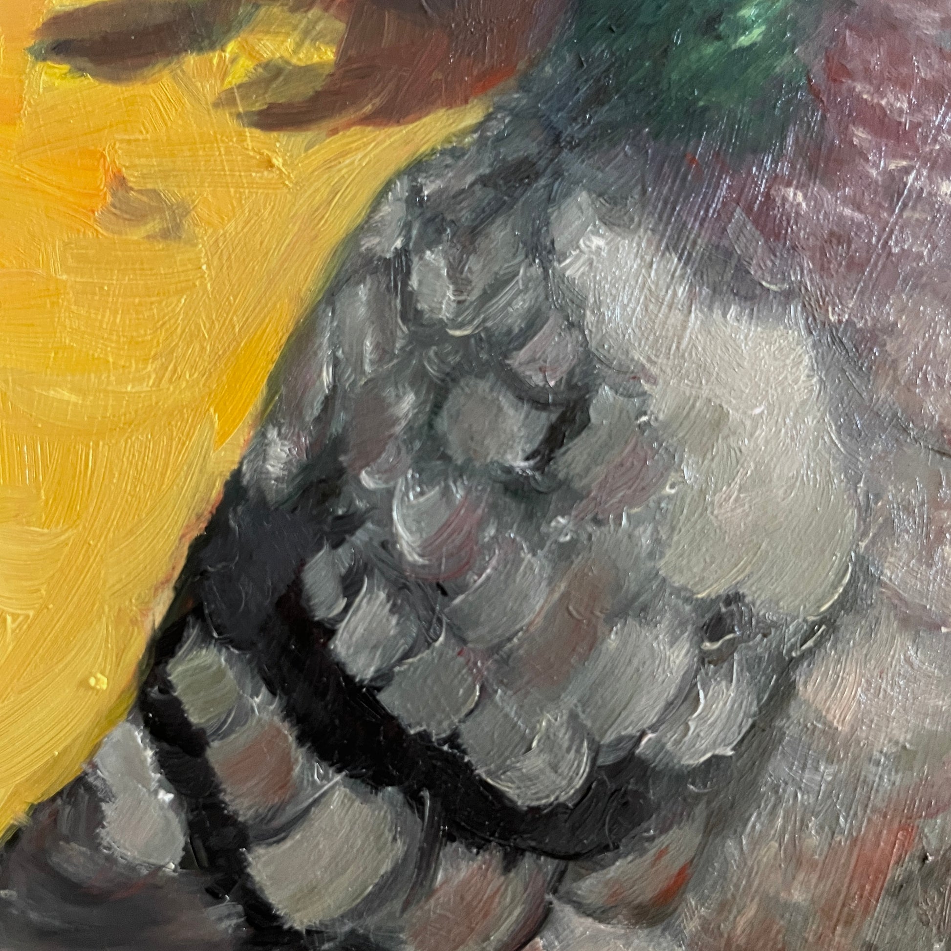 A fluffy dumb bird looking for crumbs. This original oil painting is on a cradled 6 x 6" wood board. It has a thin profile, with the sides painted black and a keyhole feature on the back that allows for hanging without the need for a frame.